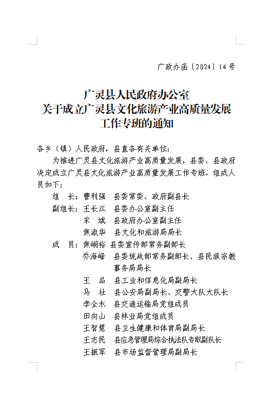 廣靈縣人民政府辦公室關(guān)于成立廣靈縣文化旅游產(chǎn)業(yè)高質(zhì)量發(fā)展工作專班的通知